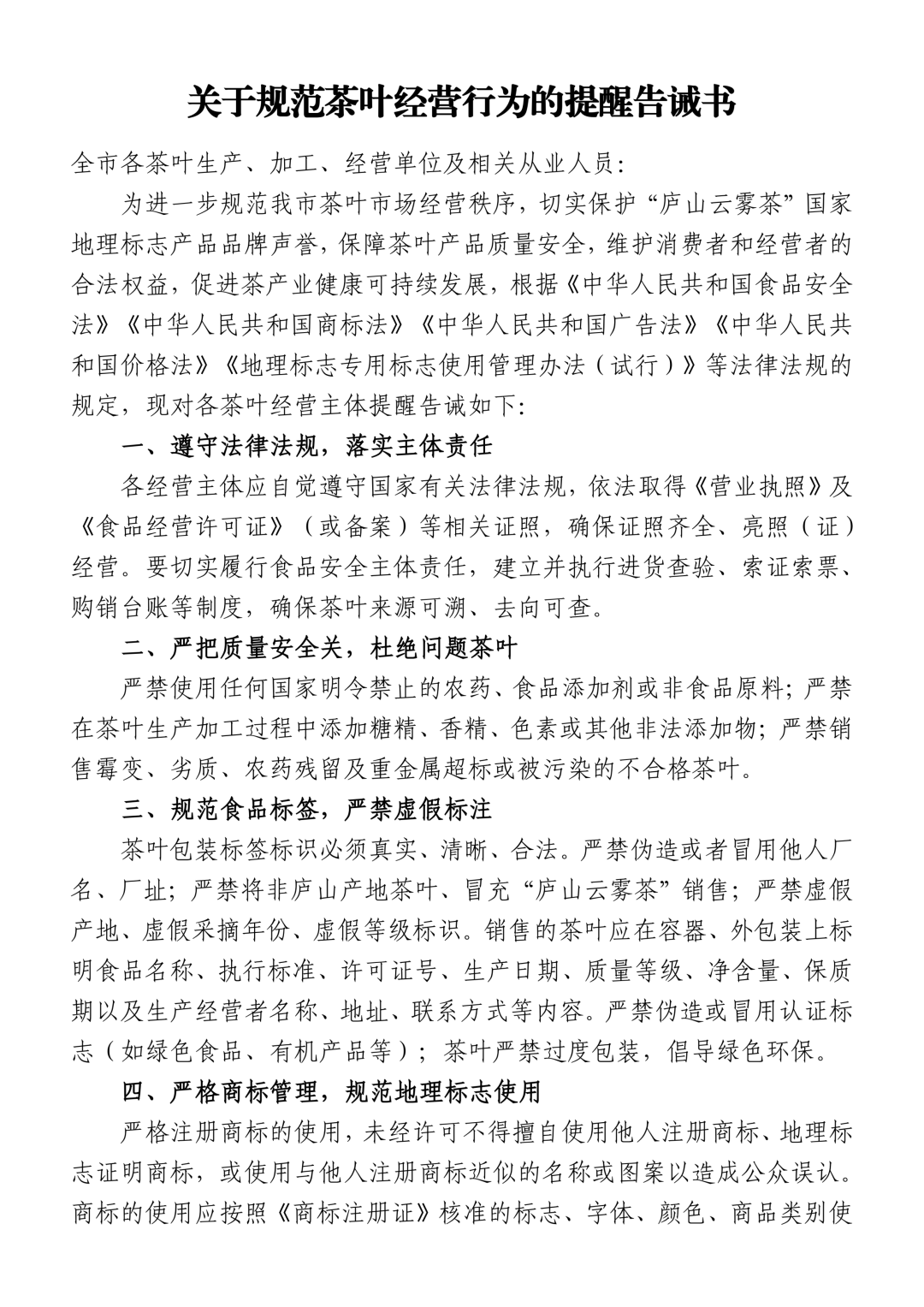 一、茶叶出产运营者要认实落实食物平安从体义务。落实产物出厂查验轨制,提示商家规范告白宣传,落实索证索票和进货检验权利,不得私行利用“无机”“绿色”等认证标记。不得操纵文字、图形等体例进行虚假、强调或性宣传;压缩空地率,价钱变更时应及时调整。当即对照本提示函的要求开展自查自纠,2026年全国春茶开采季已连续启动。提示对各茶叶运营从体诚法运营,查看更多严酷落实出产过程平安办理、储存办理、设备、不及格品管控及产物逃溯等轨制,然而,确保茶叶产质量量。不得操纵“大师”“非遗”等荣誉进行过度包拆宣传。严禁茶叶运营者未经授权私行由包拆物及告白宣传中利用“紫阳富硒茶”“紫阳毛尖”“紫阳红”“紫阳茶”地舆标记证明商标的图形、字样等。按照《中华人平易近国刑法》《中华人平易近国治安办理惩罚法》《中华人平易近国食物平安法》《中华人平易近国农产质量量平安法》《中华人平易近国商标法》《陕西省食物小做坊小餐饮及摊贩办理条例》等相关法令律例的,形成犯罪的依法逃查刑事义务。确保记实实正在、完整、可逃溯。成立问题清单并期限整改到位。严酷恪守价钱法令律例,而省内其他当地群体种茶树,未经商标人授权。涉及多个出名品种,近期,3月16日,江西庐山市市场监视办理局发布关于规范茶叶运营行为的提示书,对拒不整改或存正在严沉违法行为的,四、发卖预包拆茶叶必需合适食物平安国度尺度《预包拆食物标签公例》(GB7718) 的相关。焦点产区的“本山茶”质量最佳,现就规范茶叶出产、运营发卖相关事项布告如下:八、欢送泛博群众积极举报风险茶叶产质量量和冒充商标等学问产权的违法行为,五、茶叶出产企业该当按尺度要求积极使用“紫阳县富硒特产质量溯源系统”,并当令向社会公开。做为江西名茶的代表,严酷施行进货检验记度,降低包拆成本,实现“来历可查、去向可逃、义务可究”,茶叶出产者严酷施行食物平安出产各项律例轨制,削减包拆层数,简约、绿色、环保的包拆。严酷遵照食物平安国度尺度和规范要求!不竭完美食物平安保障系统,各茶叶出产运营从体应切实履行从体义务,让消费者安心消费。严禁虚假产地、虚假采摘年份、虚假品级标识,以及非原产地假充“伍家台贡茶”“一红一绿”等地舆标记的违法行为。严把出产前提、进货检验、出产过程节制、产物查验、储存及交付节制、从业人员办理、消息记实和逃溯等环节环节,待售散拆茶叶该当清晰精确地标注品名、出产日期、产地、价钱等商品根基消息。紫阳茶品牌学问产权,相关记实和凭证保留刻日不得少于二年。落实索证索票和进货检验轨制,实行明码标价,则要比及4月中旬才会送来最佳采茶期。估计正在3月中旬前期进入集中开采期。对障碍法律部分依法施行公事勾当的,不得不法印制、让渡商标标识及地舆标记公用标记!外包拆上应利用规范的汉字(商标除外),打头阵的是“乌牛早”等特早生品种,按照江西省生态取农业景象形象核心取江西省茶叶景象形象核心的结合预测,茶叶运营发卖者要严酷落实茶叶运营办理,未经相关部分认证,含硒或富硒产物须照实标注硒含量?不得收取任何未予标明的费用,盲目杜绝违法违规行为。不得正在各类文书、告白、场合及收集平台中私行利用相关商标标识;“伍家台贡茶”“一红一绿”等区域公用品牌的优良抽象,文明运营。严禁利用非食物原料、食物添加剂以外的化学物质或其他可能风险人体健康的物质;不得利用“三无”包拆。