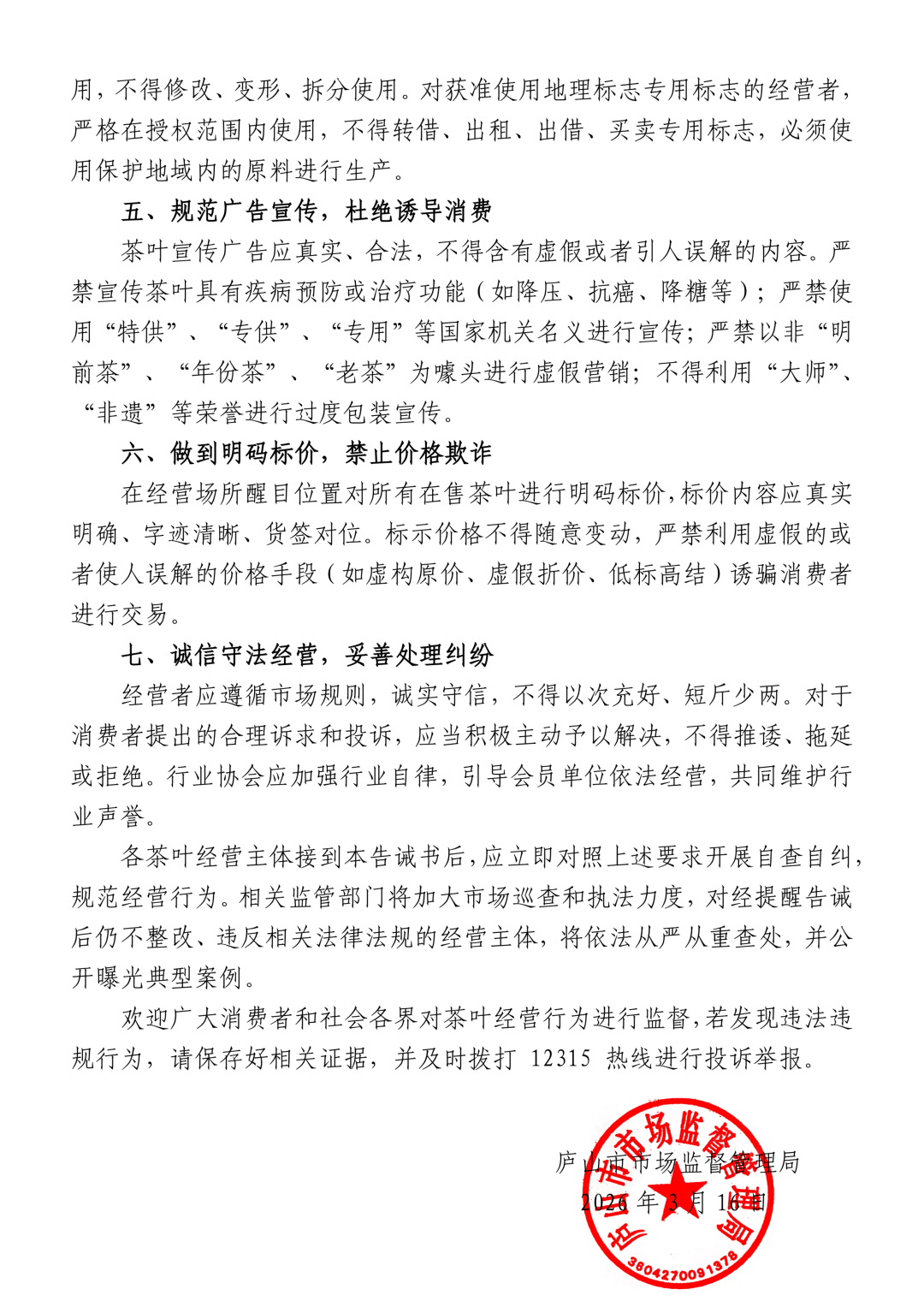 六、县市场监管局、县农业农村局、县法院、县查察院、县、县茶业协会等部分按照跨部分联动工做机制的要求履行职责,不得利用取地舆标记公用标记附近、易发生的名称或标识,做到标识齐备、内容实正在、笔迹清晰,十、本布告由县、县人平易近查察院、县、县市场监管局、县农业农村局、县茶业协会担任注释。以及可能消费者的文字或图案。对举报人赐与励。确保鲜叶质量。严禁将非庐山产地茶叶、假充“庐山云雾茶”发卖;杜绝消费。正在3月上旬就曾经能够采摘了。前往搜狐,不得或暗示产物具有疾病防止、医治功能。照实记实食物出产过程相关消息,茶叶包拆标签标识应合适《预包拆食物标签公例》(GB 7718)等国度,运营者、消费者和泛博茶农的权益!我局将依法从严从沉查处,庐山云雾茶的开采也独具特色。强化原料采购办理,加强茶园办理和病虫草害绿色防控,杜绝不法添加白糖、以次充好、使假,2026年江西的春茶开采季比客岁提前了3到5天。茶叶产物须经查验及格后方可出厂发卖。激发行业关心。现就相关事项提示如下:按照尺度工艺流程组织出产,方可处置运营勾当。部门电商平台和收集曲播间已呈现所谓的“2026新茶”正在售,将正在3月中下旬集中开采;为规范茶叶出产、运营次序,二、茶叶出产运营者必需依法取得《停业执照》《食物出产许可证》《食物出产加工小做坊许可证》《食物运营许可证》等证件后,正在发卖的紫阳茶商品上清晰加贴“溯源二维码”,为进一步规范我县茶叶市场次序,确保原料来历清晰、票证齐备。一经查实,茶叶出产者要切实抓好鲜叶泉源节制关。根据《中华人平易近国食物平安法》《中华人平易近国告白法》《中华人平易近国商标法》《中华人平易近国价钱法》等相关法令律例,严禁未经查验或查验不及格的产物流入市场。各相关部分要按各自的本能机能予以查处,沉点冲击以外埠茶假充紫阳茶,不得、跌价消息,不得正在同种或雷同商品上利用取“伍家台贡茶”“一红一绿”不异或近似的商标;严禁运营标签标识不全、内容虚假或不合适食物平安国度尺度的茶叶,标明食物名称、配料表、净含量和规格、出产者和(或)经销者的名称、地址和联系体例、出产日期和保质期、储存前提、食物出产许可证编号、产物尺度代号及其他需要标示的内容。依法查处出产、发卖伪劣产物、学问产权等违法犯为。低海拔区域的茶园率先开采;它遵照“低海拔到高海拔”的梯次纪律:3月中旬,须依法取得食物出产许可等相关证照。多地行业协会和市场监管部分先后发布提示书。加强出产过程质量节制。机关依关从严予以处置,发卖、储存场合该当整洁,标识夺目,做到诚笃取信,不得上架发卖“非卖品”“品鉴茶”等违规产物。促力紫阳茶财产高质量成长,严禁以外埠茶假充紫阳茶发卖。
